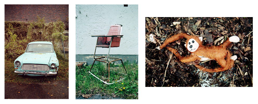 Von Vergänglichkeit und Verfall sprechen die Bilder von Heike Bogenberger, die seit 2007 im Projekt (Dokumentation Domagk) ist. Sie widmet sich in Ihrer Arbeit der Spurensuche vor Ort. In Ihrer Arbeit finden sich ebenso gefundene Objekte, doch geht es nicht um das Abtasten der Oberfläche, sondern durch die bewusst gesetzte Farbigkeit und das Herauslösen aus ihrem Umfeld werden sie zu melancholischen Porträts von Gegenständen. Der Affe, der Kinderstuhl, der Trabi – das fotografierte Objekt bekommt in den Bildern eine Persönlichkeit und eine Geschichte, die nur im Kopf des Betrachters erzählt wird. Sie selbst sagt, dass ihr die so lebendige Atmosphäre des Geländes von Anbeginn sehr gefallen hat. Die Künstler, die auf dem Gelände wohnten, verliehen dem Areal einen ganz eigenen, vielfältigen und besonderen Charakter. Vielleicht hebt sich in ihren Bildern deshalb die Grenze zwischen Kunstobjekt und Alltagsgegenstand einfach auf.